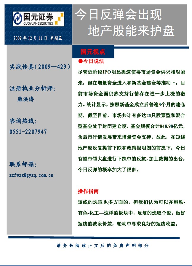 12月11日國元證券實戰(zhàn)傳真