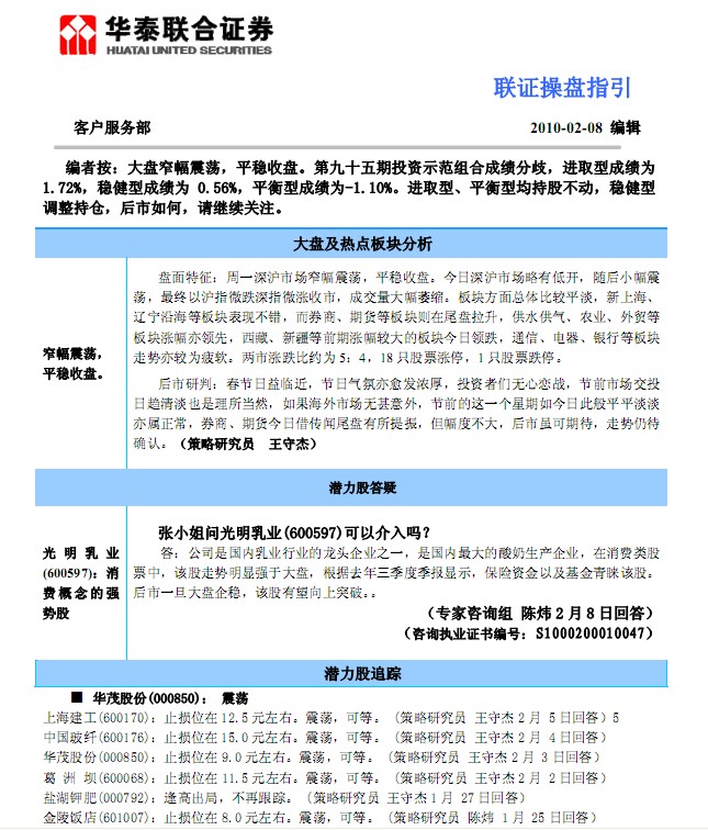 盤面特征:周一深滬市場窄幅震蕩,平穩(wěn)收盤。今日深滬市場略有低開,隨后小幅震蕩,最終以滬指微跌深指微漲收市,成交量大幅萎縮。板塊方面總體比較平淡,新上海、遼寧沿海等板塊表現(xiàn)不錯,而券商、期貨等板塊則在尾盤拉升,供水供氣、農(nóng)業(yè)、外貿(mào)等板塊漲幅亦領(lǐng)先,西藏、新疆等前期漲幅較大的板塊今日領(lǐng)跌,通信、電器、銀行等板塊走勢亦較為疲軟。兩市漲跌比約為 5:4,18 只股票漲停,1 只股票跌停。 后市研判:春節(jié)日益臨近,節(jié)日氣氛亦愈發(fā)濃厚,投資者們無心戀戰(zhàn),節(jié)前市場交投日趨清淡也是理所當(dāng)然,如果海外市場無甚意外,節(jié)前的這一個星期如今日此般平平淡淡亦屬正常,券商、期貨今日借傳聞尾盤有所提振,但幅度不大,后市雖可期待,走勢仍待......