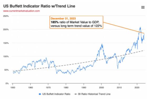 除此之外,巴菲特所發(fā)明的巴菲特指標(biāo)同樣表示「當(dāng)前美股市值已高估」,通常75%至90%為一合理區(qū)間,若超過120%則表示股市高估,然而當(dāng)前指標(biāo)竟高達(dá)185%,遠(yuǎn)遠(yuǎn)高于指標(biāo)對(duì)于傳統(tǒng)泡沫的定義。對(duì)此,CPT Markets分析師指出巴菲特指標(biāo)存在一缺陷,該指標(biāo)指的是股市總市值與GDP的比值,以其來判斷整體股市的估值水平是否過高或過低,而讀者須注意的是「該指標(biāo)無法準(zhǔn)確地反映國際貿(mào)易的真實(shí)狀況」。簡單來說,股票市值能反映了國際活動(dòng)但GDP卻沒有,而此因素卻容易導(dǎo)致該指標(biāo)產(chǎn)生一大偏差。