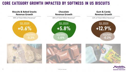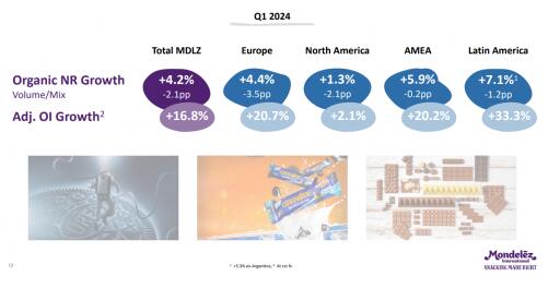 Mondelez在不同地區(qū)的業(yè)務(wù)狀況呈現(xiàn)出多樣性。在拉丁美洲地區(qū),營收達(dá)到$1,319Mn,年增長率達(dá)到8.9%,有機(jī)增長為7.1%。盡管銷售量略有下降,但由于產(chǎn)品組合和定價(jià)策略的提升,整體表現(xiàn)仍然穩(wěn)健。 亞洲、中東及非洲地區(qū)的營收為$1,950Mn,年增長率為0.6%,有機(jī)增長達(dá)到5.9%。盡管面臨銷售量的微幅下降,但通過產(chǎn)品組合和定價(jià)策略的優(yōu)化,該地區(qū)業(yè)務(wù)表現(xiàn)依然強(qiáng)勁。