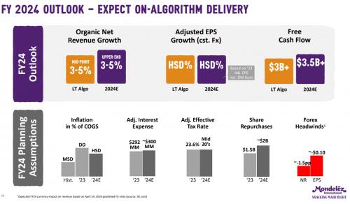 Mondelez International 維持了對于 2024 年的預(yù)期指引。在這份指引中,他們預(yù)計(jì)營收將保持有機(jī)增長率在 3% 到 5% 之間,調(diào)整后的每股盈利(EPS)預(yù)計(jì)年增率將達(dá)到 HSD%(高單位數(shù)),并預(yù)計(jì)自由現(xiàn)金流將超過 35 億美元。 然而,公司也提到預(yù)期匯率逆風(fēng)將對 2024 年的營收增長產(chǎn)生約 1.5% 的不利影響,對調(diào)整后的每股盈利(EPS)帶來約 0.1 美元的負(fù)面影響。