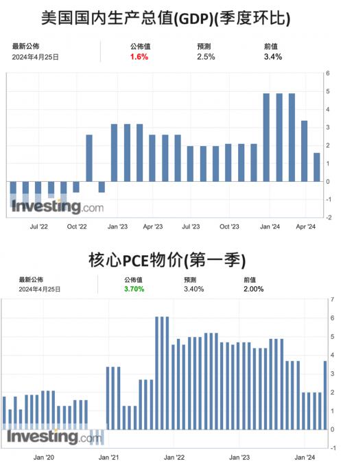 再來,我們看一下美國國內(nèi)生產(chǎn)總值(GDP)的情況,因為GDP是衡量一個國家經(jīng)濟(jì)總量的重要指標(biāo),其季度環(huán)比變化可以反映出經(jīng)濟(jì)增長的趨勢。最新公布的美國第一季度GDP年增率僅1.6%,顯著低于市場預(yù)期的2.5%,顯示目前美國經(jīng)濟(jì)正面臨成長壓力。