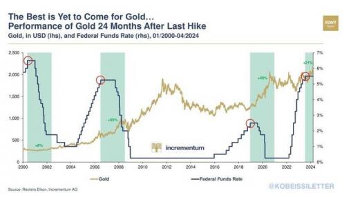 除了科技七巨頭表現(xiàn)亮眼外,近期金價(jià)亦狂飆不已,讓不少投資人開始好奇金價(jià)未來走勢。根據(jù)過去經(jīng)驗(yàn),金價(jià)往往會(huì)在美聯(lián)儲(chǔ)最后一次加息后24個(gè)月內(nèi)顯著上漲,舉例來說,2006至2008年期間,黃金價(jià)格上漲了55%;在2018至2020年,同樣的趨勢再次出現(xiàn),黃金價(jià)值飆升了近50%。然而,于此次加息周期內(nèi),最后一次加息是發(fā)生在2023年7月,此后,金價(jià)竟在短短7個(gè)月內(nèi)累計(jì)上漲21%;谏鲜鏊畾v史表現(xiàn),當(dāng)前金市是否將迎來又一輪大牛市,成為市場高度關(guān)注的焦點(diǎn)。