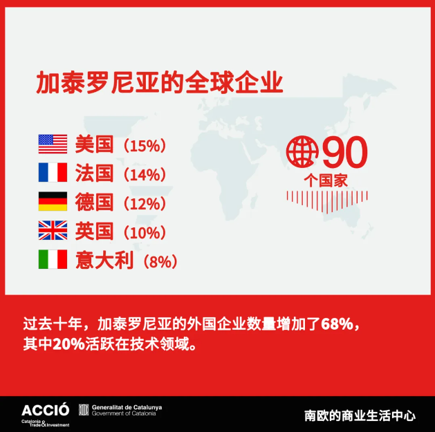 在加泰羅尼亞的外國企業(yè)中,美國占比最高(15%),法國(14%)、德國(12%)、英國(10%)和意大利(8%)是主要來源國。此外,荷蘭(同比增長9%)、美國和法國(各增長6%)以及加拿大(增長12%)的外資子公司數(shù)量增長尤為顯著。目前,加泰羅尼亞已經(jīng)吸引了來自90余個國家的企業(yè)落戶。