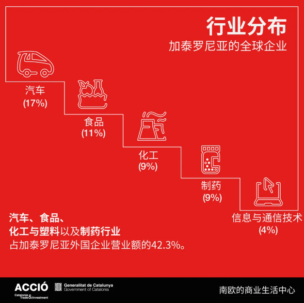 從行業(yè)分布來看,加泰羅尼亞的外資企業(yè)主要集中在汽車行業(yè)(占17%)、食品行業(yè)(11%)和化工行業(yè)(9%)。