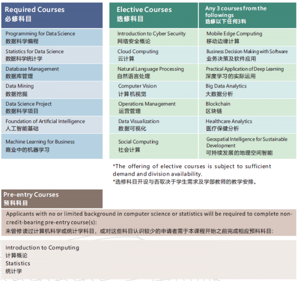 學(xué)生需要修讀7門(mén)必修科目和3門(mén)選修科目。未曾修讀過(guò)計(jì)算機(jī)科學(xué)和統(tǒng)計(jì)學(xué)科目或?qū)@些科目認(rèn)識(shí)較少的申請(qǐng)者,可在開(kāi)學(xué)前完成相應(yīng)的預(yù)科科目(計(jì)算概論和統(tǒng)計(jì)學(xué))。