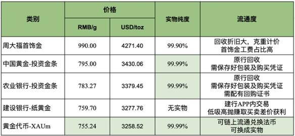 市面上黃金投資種類眾多,從紙黃金、投資金條、首飾金到基于區(qū)塊鏈技術(shù)的黃金代幣,種類繁多的黃金投資品該怎么選?下圖盤點了市面上的主題黃金投資標(biāo)的,從價格、實物純度以及流動等領(lǐng)域為大家做直觀展示。