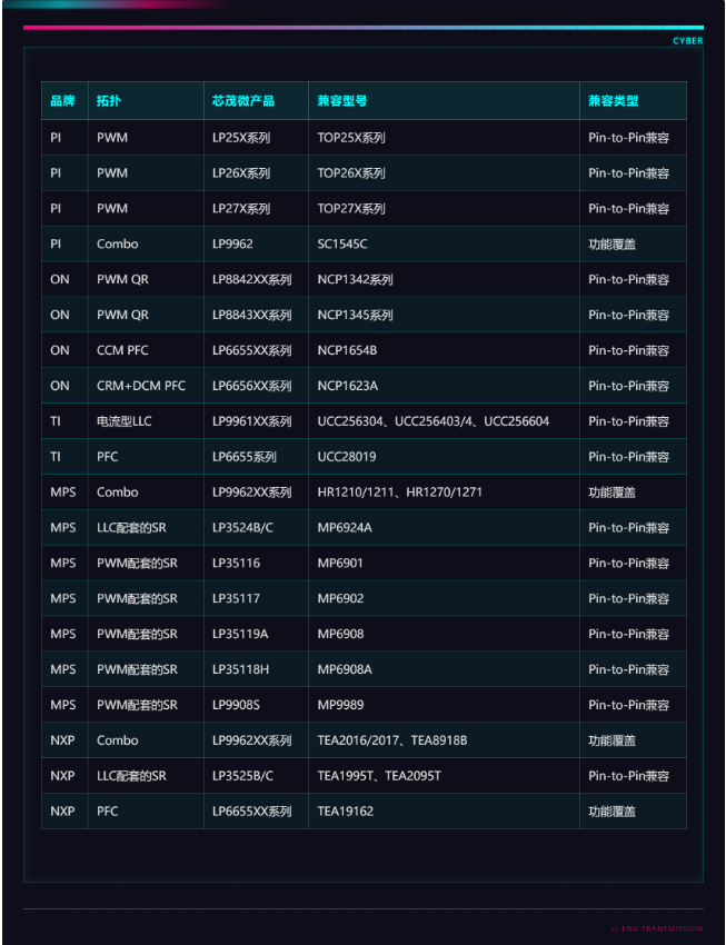 芯茂微專注于電源管理芯片,其產(chǎn)品線覆蓋PWM、QR、Combo、SR、PFC、CCM PFC、CRM+DCM PFC、LLC等多種拓?fù)浣Y(jié)構(gòu),與多家海外知名品牌(如PI、ON、TI、MPS、NXP)高度兼容。以下是芯茂微產(chǎn)品兼容性的詳細(xì)歸納,按照品牌和拓?fù)浣Y(jié)構(gòu)進(jìn)行結(jié)構(gòu)化整理,清晰展示兼容性信息: