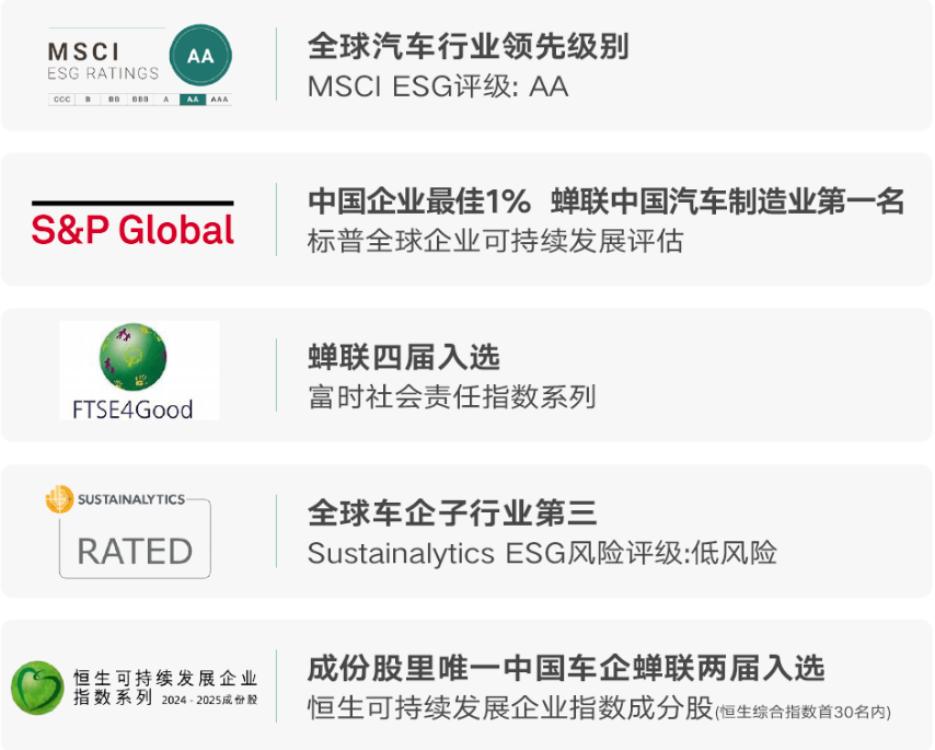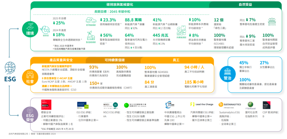 憑借ESG實踐與透明披露,吉利汽車2024年獲《財經(jīng)》雙碳領(lǐng)導(dǎo)力“卓越”評級,蟬聯(lián)“中國ESG上市公司先鋒100”車企榜首,MSCI ESG評級AA級、恒生可持續(xù)發(fā)展企業(yè)指數(shù)等榮譽,鞏固其中國車企ESG標桿地位。